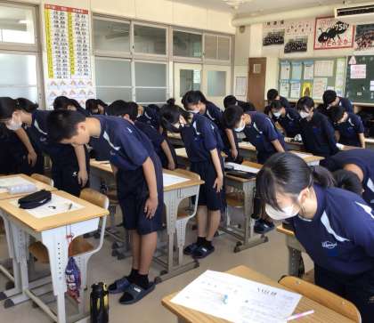 先日、9月に行われる職場体験学習に向けて、株式会社マナーマネジメント名古屋様より、講師の方をお招きしてマナー講座が行われました。生徒たちは「私の礼儀作法とか、マナーって大丈夫かな」と緊張しながら始まりましたが、心地よい緊張感の中で、ロールプレイなども交えながら、社会人として大切な礼儀やマナーについて学ぶことができました。振り返りでは「今日学んだあいさつや返事を職場体験で実践したい」「礼儀やマナーは職場体験だけでなく、普段から行って行くことが大切だ」と、礼儀やマナーについてより深く学ぶことができました。