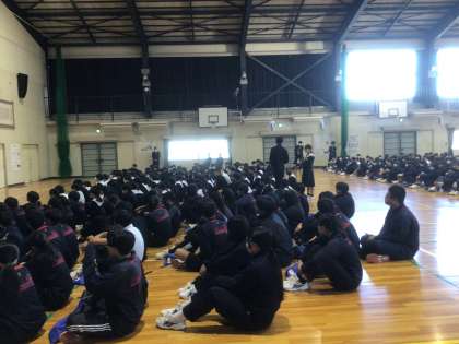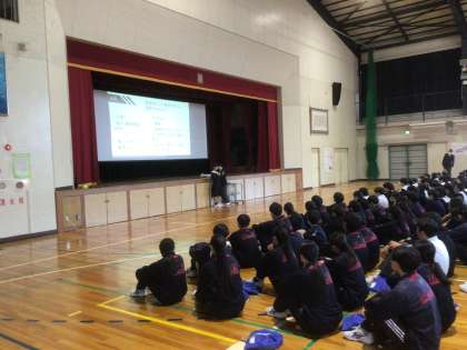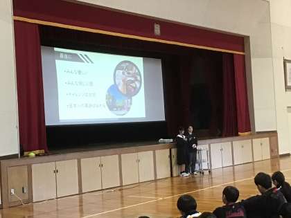 海外派遣に参加した2名の生徒による報告会を行いました。アメリカとイギリスに派遣された生徒から、それぞれの追究課題について発表があり、日本と現地の文化の違いに触れながら、学んだことをわかりやすく紹介してくれました。発表の中にはクイズも取り入れられ、全校生徒が楽しみながら学べる時間となりました。堂々とした発表から、海外での経験を通して得た成長が感じられました。今後も前中生のさらなる活躍に期待しています。