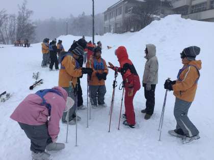初めてスキーを経験する生徒も多く、インストラクターの方に丁寧に教えてもらっています。初めての経験で、少しの斜面でも「怖い〜!」「楽しい〜!」と生徒たちの声が聞こえてきました。今日は基本的な技術を教えてもらい、明日から本格的にゲレンデを滑ります。