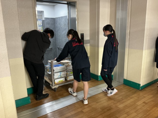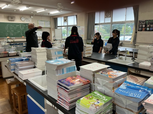 1年生から3年生までの全クラスに、ワゴンに山盛りの教科書を運びます。