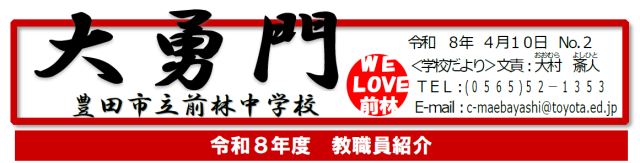 「学校だより 大勇門 No.2」発行 公開日 2026/04/10 更新日 2026/04/10 校長室から 学校だより 大勇門 No.2を発行しました。今号の内容・令和8年度 教職員紹介・「きずなネット」による文書の配付について下記をクリックして御覧ください。大勇門 No.02閲覧するためには、本日きずなネットで配信したPWの入力が必要です。 校長