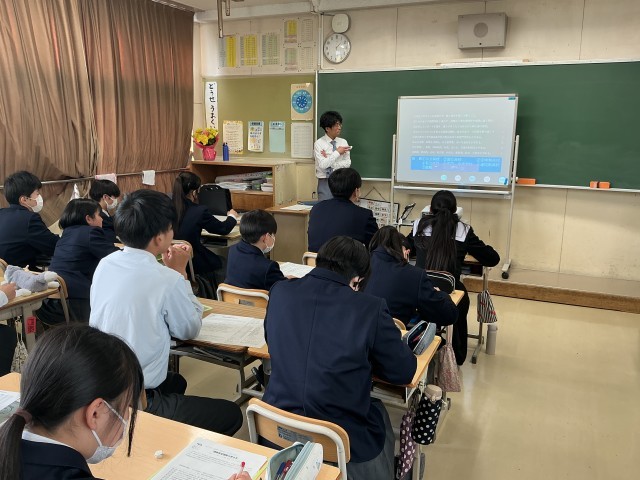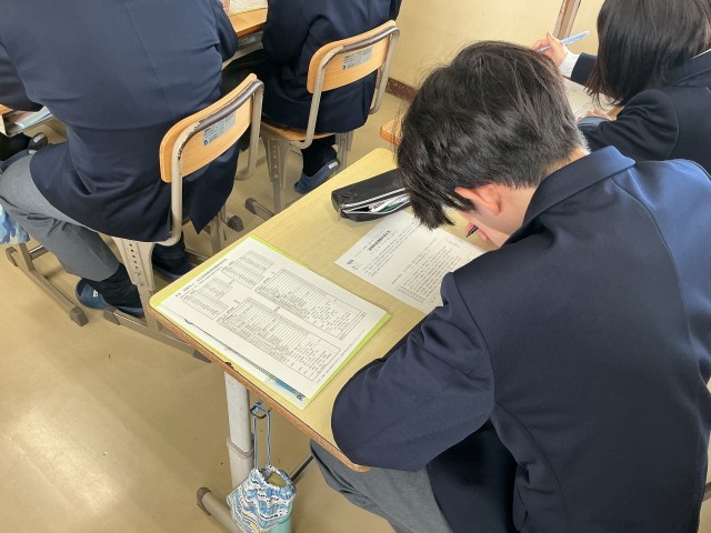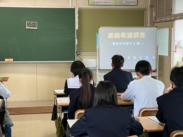4/13 3年 進路学習 公開日 2026/04/13 更新日 2026/04/13 各学年から 3年生は、進路指導主事の指導のもと、進路学習の一環として進路希望調査の書き方を学び、様々なな進路選択を例に練習しました。生徒たちは、自分の将来について考えるよい機会となったようです。 3年