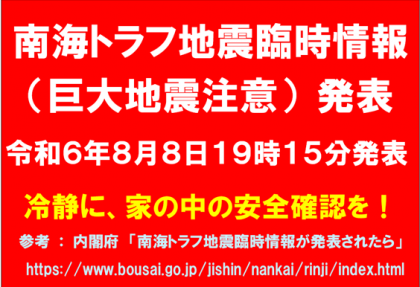 南海トラフ地震臨時情報(巨大地震注意)