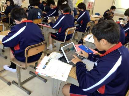2年生英語の授業ではシンガポールについてタブレットで調べて、自分で旅程を考えていました。