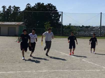 1年生が全員リレーを行っていました。あら、なぜか最後は先生が...