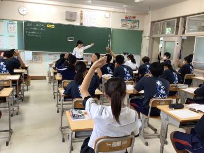 教育実習生研究授業 公開日 2023/06/07 更新日 2023/06/07 校長室から 31学級で教育実習生が道徳科の授業をしました。たくさんの先生に囲まれ、緊張も感じられましたが、生徒たちの活発な意見でスムーズに進みました。