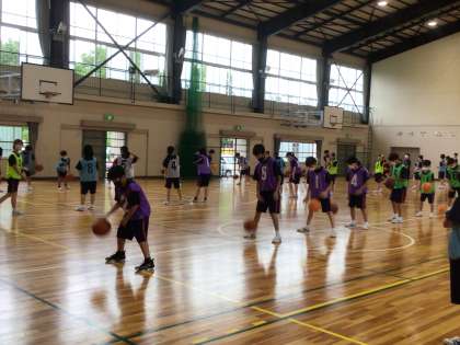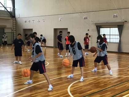 雨が降り続いていますが、校内は生徒の明るい声が響いています。1年生の体育ではバスケットボールの授業をしていました。