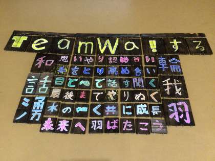 学級の誓いの時間です。 学年旗と昨日作った焼き板パネルの披露がありました。