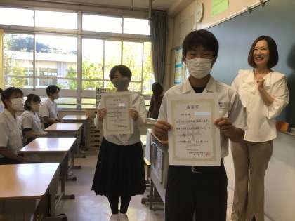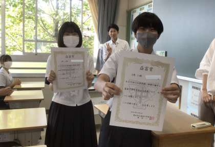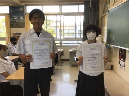3年生に前期益富賞を渡しました。団長をしたり、普段の生活の中で友達や学級を支えた生徒を表彰しました。
