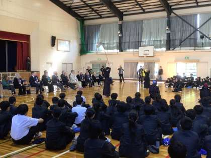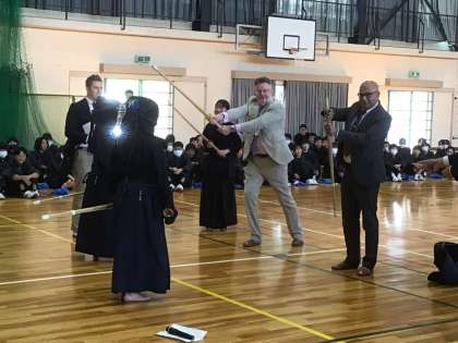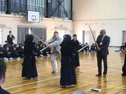 剣道部が技の披露をしました。ダービーシャーの方にも竹刀を握っていただきましたが、面をかぶっているとはいえ、人の頭を叩くということに抵抗があったようです。