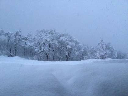 おはようございます。今朝の妙高は雪です。昨夜か降り続いています。最高気温は2度、最低気温は0度のようです。今から朝の集いが始まります。