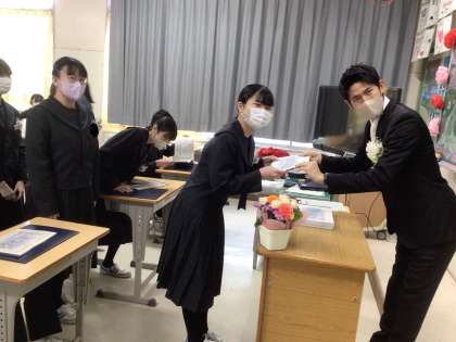 卒業式の後は、各学級であたたかい雰囲気の中、最後の学級活動が行われていました。