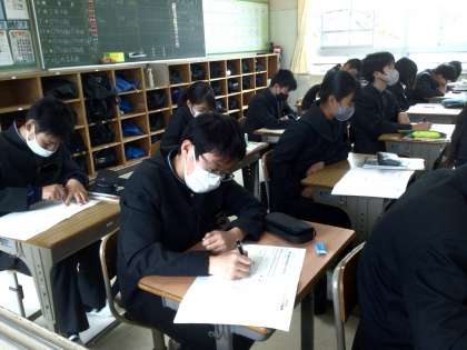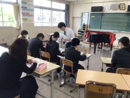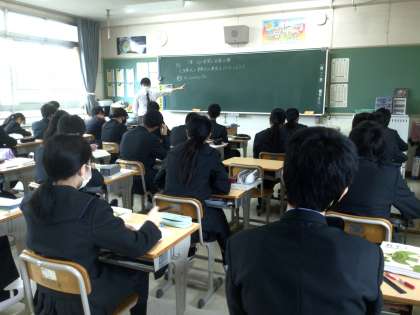 2年生英語科では春休みのことを英作し、特別支援学級音楽では、ハンドベルを演奏していました。3年生は教頭先生の数学科の授業が行われていました。