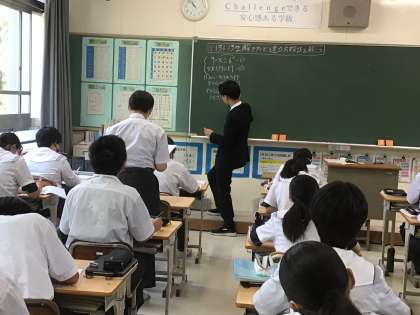 23学級で教育実習生が授業を行いました。生徒は、連立方程式の解き方をグループで、どの方法が解きやすいかなどを話し合いました。