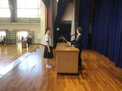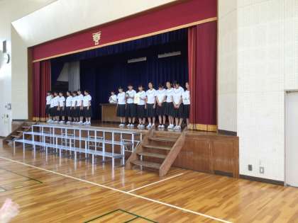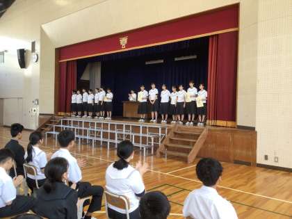 野球部、ソフト部、テニス部、卓球部、吹奏楽部が登壇しました。この他にも夏休みの作文の表彰をしました。