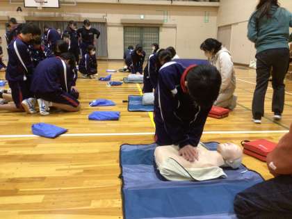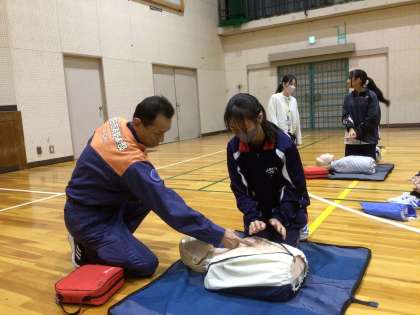 呼吸の確認の仕方や圧迫のリズムなど教わり、全員が胸骨圧迫に挑戦しました。