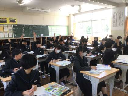 授業中には、積極的に挙手をして自分の意見や考えを発言する生徒が多く見られます。先生の問いかけに対して自分なりの答えを考え、思い切って手を挙げる姿からは、学びに対する意欲や前向きな姿勢が感じられます。友達の意見を聞いて「なるほど」とうなずいたり、「私はこう思います」と新たな視点を示したりする場面もあり、教室全体が活気に満ちています。