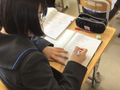 数学では、「文字と式」の計算に取り組んでいます。基本的なルールをしっかりと押さえながら、自分なりに工夫してポイントをわかりやすくノートに整理する姿が見られました。計算の過程を丁寧に書き残すことで、復習や確認にも役立つノートとなっており、学習への意欲と工夫が感じられます。