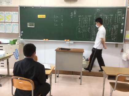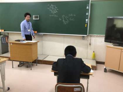 1、2学級の授業です。授業の様子です。数学の授業では、図形の面積の求め方を学び、国語の授業では、文章の内容を意識しながら音読に取り組んでいました。