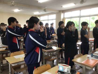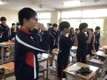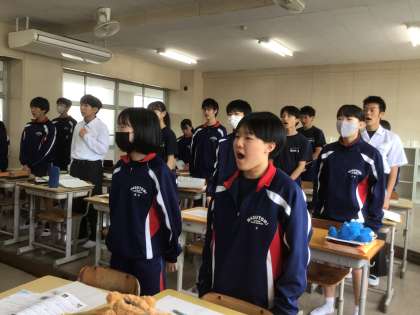 音楽の授業です。テンポよく発声練習を行ったあと、校歌を合唱しました。
