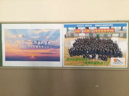 自分が変われば、世界が変わる!2、3年生の昇降口前の掲示板で毎朝生徒を出迎える掲示物です。