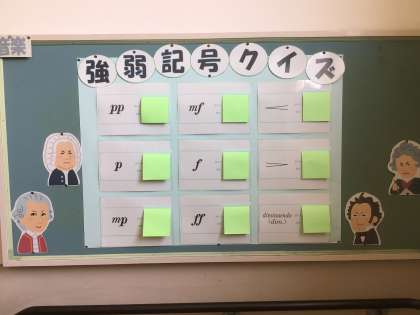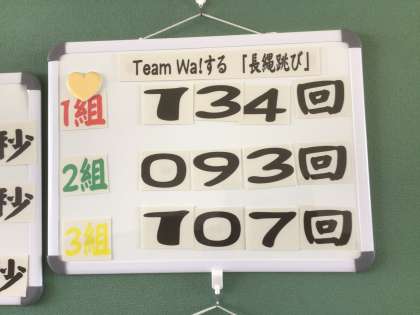 音楽室の前には音楽記号のクイズがあります。合唱の楽譜を読むのに役立ちます。そして3年生の長縄跳びの現在の最高記録です。本番でどのクラスも自己最高記録を目指して頑張っています。