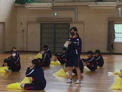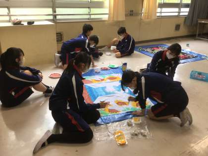 応援旗の色を塗ったり、体育祭種目「益富コンテスト」のフォーメーションを確認したりしています。