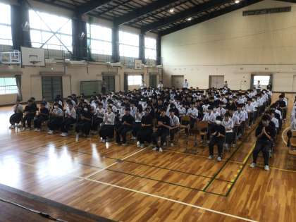 夏休み前の全校集会が行われました。今年度からは体育館にエアコンが設置され、昨年まで暑さのため避けていた体育館での集会が可能となり、全校生徒が一堂に会することができました。