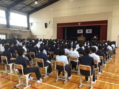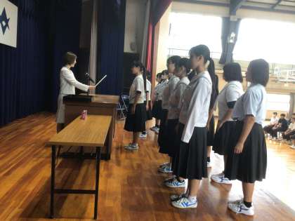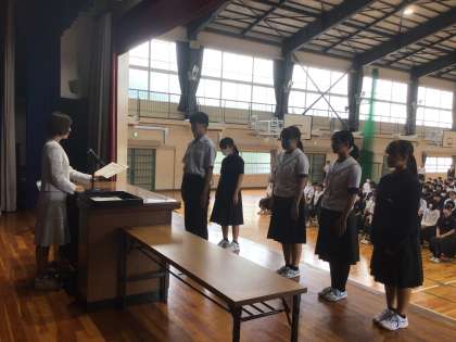 終業式の前に表彰伝達がありました。女子テニス部、女子卓球部が優秀な成績で表彰されました。