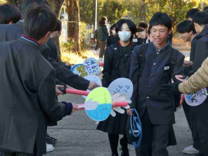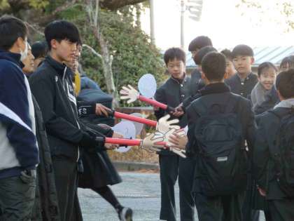 ハイタッチ棒を使って、ハイタッチをしながら挨拶をしています。