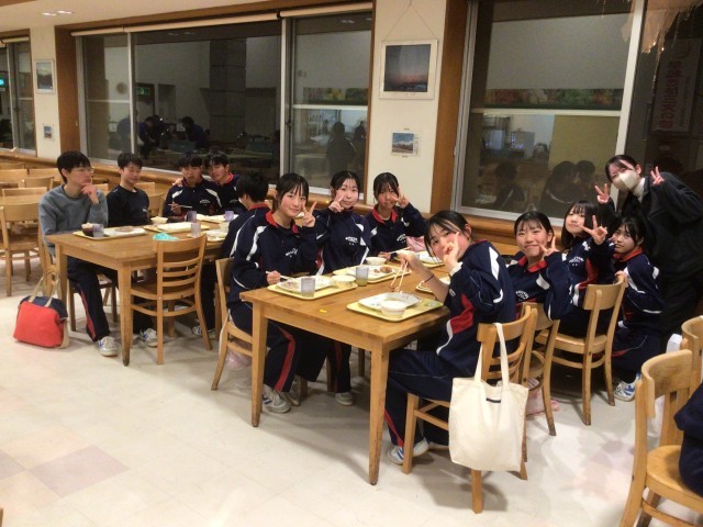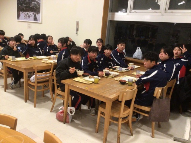 2日目の夕食の様子です。本日の夕食は鶏のの竜田揚げでした。チョコクレープがデザートにあり、スキーで疲れた体に甘いものが嬉しかったです。