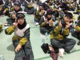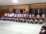 退所式をして、おにぎりを食べています。この後、バスで帰途につきます。