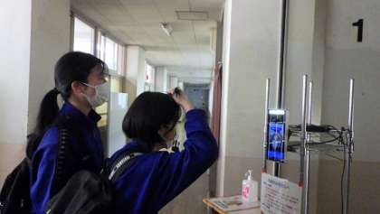 登校時には、昇降口で、教職員による「おはよう」の声かけとともに、非接触型体温計での検温をしたり、生徒自身が顔認証型のサーマルカメラを使って体温を測定したりする光景が見られます。