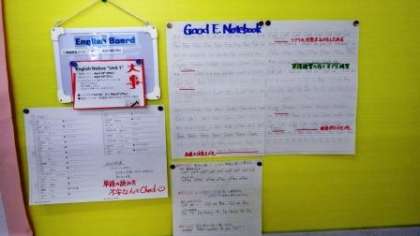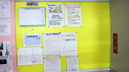 1年生の学年掲示板では、漢字のテストの内容や英語のノートづくりのアドバイス等、各教科の学習の参考になるお知らせが紹介されています。