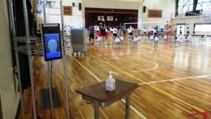 バレーボールの会場では、感染症対策を講じるため、各箇所への消毒液の設置や、間隔をとった上での指定数の保護者席の設置などを行いました。保護者のみなさまには、選手と同様、座席の移動の際の椅子の消毒作業や、声を発しない応援にご理解、ご協力をいただきました。