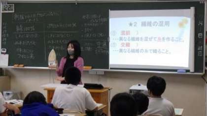 家庭科では、日常生活の中から課題を設定し、解決していく力を育てていきます。この授業では、「(自分の着ている)制服の手入れができるようになろう」という課題の解決をめざします。まず、夏の制服の繊維である綿とポリエステルの各100パーセントの布を触って、実感を伴って特徴をつかみました。次に、それらの混紡の制服の洗濯やアイロンがけの方法を調べました。適切なアイロン掛けの手順や方法は、手元や細部まで見えるように、大型画面の動画で視聴しました。
