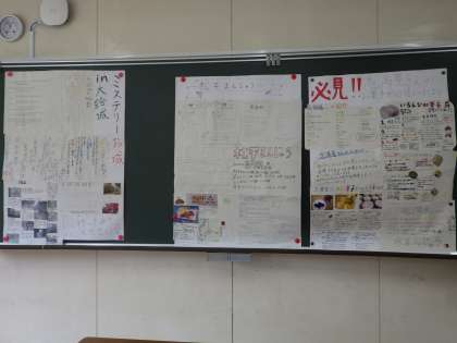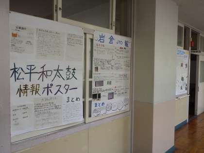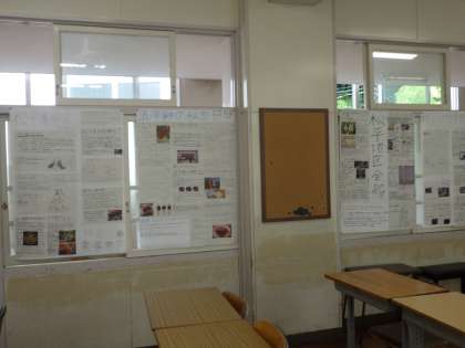 本校の3階奥にある学習室3では、1年生の「総合的な学習の時間」のまとめで作成したポスターが掲示されています。インタビューで伺った内容や生徒たちが調べた内容が写真やイラストを添えてわかりやすくまとめられています。クイズ形式で地域のことを学ぶこともできます。本校にお越しになった時は、ぜひご覧ください。