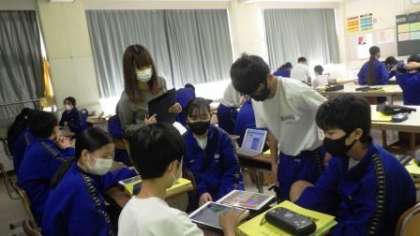 本校では、どの子にも「わかる・できる授業」や、新学習指導要領のめざす「主体的・対話的で深い学び」の実現のため、全教職員で研修を行っています。今年度は、研修テーマを「基礎力を身につけ、主体的・対話的に学ぶ生徒の育成」−わかる」、「深い学び」の実現に向けた授業づくりーとし、継続的に授業研究会を行っています。その一環として、教職員がペアになって、授業を参観し合う「授業力向上WEEK」を一年を通して、計画的に実践しています。今年度、第2回目として、9月27日(月)から、1週間行います。初日の1時間目には、1年2組で、美術の授業を担任が行いました。