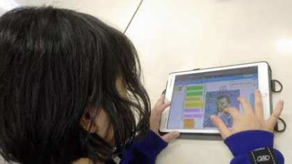 この授業では、「自画像をじっと見つめて想像して」という題材で、ゴッホの絵を取り上げ、鑑賞の活動を行いました。学習課題である「鑑賞の観点を使って観賞し、物語を考えることができる」ことの達成をめざしました。ゴッホの気持ちを考える鑑賞の観点として、表情や色、背景、その他(ものなど)の4つを使いました。自分の考えをまとめる際には、タブレットのSKY MENUを使い、可視化しやすいように観点を記載する色を指定して行いました。そこでは、「青みがかった色づかいから、悲しんでいる様子を表していると思う」などの意見が出されました。班で話し合い、まとめた意見を、代表生徒がプロジェクターで表示して、学級全体で意見交流しました。