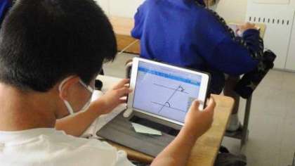 この授業では、平行線と角の関係を調べ、角の名称と特徴を理解することが学習のねらいです。生徒たちは、平行線と直線からなる角のどこが等しくなるかを探します。それぞれの考えは、タブレットのSKY MENUを使って、スクリーン上で共有します。そして、2直線が平行な時に、同位角や錯角がそれぞれ等しくなることを知りました。最後に、演習問題に取り組み、学んだことを確実に習得できるようにしました。