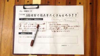 この授業では、バレーボールで「3段攻撃を使い、得点を取ろう!」をねらいとしています。はじめに、準備運動として「元気っ子体操 松平バージョン」を行い、身体をほぐします。次に、バレーボールの基本的な動きを簡単にした補助運動を行います。いよいよ、チームでパスやサーブの練習をします。チームで試しのゲームをした後、学習用タブレットで、お手本の動きと、自分たちの動きを比較して、違いを見つけます。そして、ミーティングで、お互いにアドバイスをし、3段攻撃につながるように、動きを改善していきます。そして、再度ゲームに挑戦し、成果を確かめました。