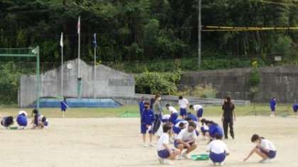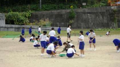 10月11日(月)の5時間目、体育祭練習の本格的な開始を前に、1年生が運動場の草取りや石拾いをしました。学年のリーダー会が企画し、学級ごとに必要な場所を話し合い、分担区域や内容を事前に決めて、活動しました。