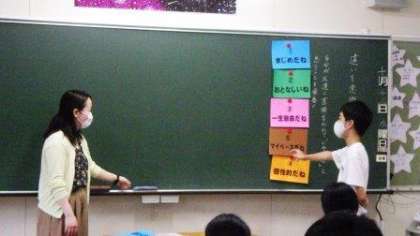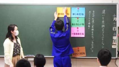10月13日には、1年生の道徳科で、教科書を活用して、「直接伝えることとSNSなどで伝えることの違いを意識したコミュニケーション」について考えました。