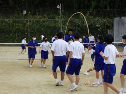 各学年の体育の授業の時間では、ソーラン節以外の種目の練習にも取り組んでいます。また2年生は、学年全体で大縄跳びの回数を競い合っていました。生徒たちは体育祭本番に向けて、改善点や今後の練習の方針について話し合っていました。