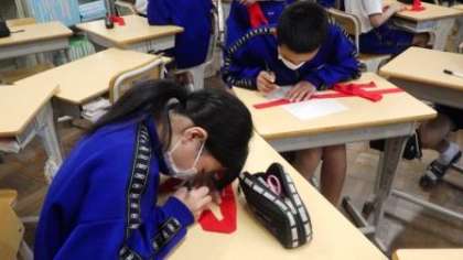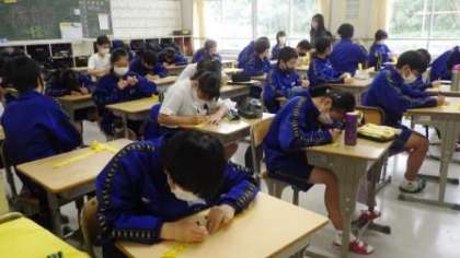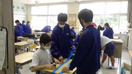 メッセージ交換 公開日 2021/10/22 更新日 2021/10/22 お知らせ 体育祭を明日に控え、今日の午前中は、松中ソーランの総仕上げの練習を行いました。午後は、各係で準備をし、その後、当日額に巻く各自のたすきに、友達からメッセージを書いてもらっていました。 会場は準備万端。各団とも気合十分です。
