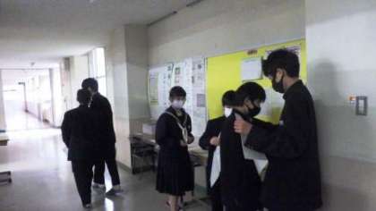 テストに向けて、学習計画を提出して状況を担任が確認したり、よりよいものになるよう再検討したりする取組を行いました。また、1年生の掲示板前には、自主学習用の追加プリントも置いてあり、勉強の進み具合に応じて、手に取ったり、友達と進捗状況を情報交換したりする姿が見られました。テスト本番は、受験心得を黒板に掲示して再確認していました。