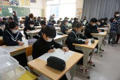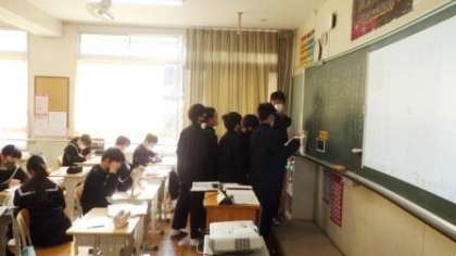 1年1組は国語科で、初めての本格的な古文の学習となる「蓬菜の玉の枝『竹取物語』から」の授業でした。現代文と古文を読み比べ、時代による言葉の使い方や文化の違いを味わいました。「いふ」「うつくしう」など歴史的仮名遣いを、現代的仮名遣いに置き換えて書き表す課題に対して、積極的に挙手をして、代表生徒が黒板に書く姿が見られました。