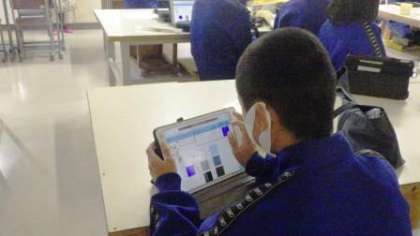 1年3組は美術科「名画の色を再現しよう」をテーマに、まず、学習用タブレットを活用して、明度や彩度について調べました。一つの色をもとに、混色により、様々なニュアンスが生み出せることを知り、ゴッホの名画「ひまわり」の色遣いを再現できる技法を体験しました。
