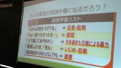 この授業では、1年生の発達段階に合わせて、どの生徒にも資料の内容が十分理解できるように、まず、「誹謗中傷」の定義を確認しました。次に、「給食をこぼした」という事例をもとに、周囲のどんな反応言動が誹謗中傷にあたるのかについても確認しました。