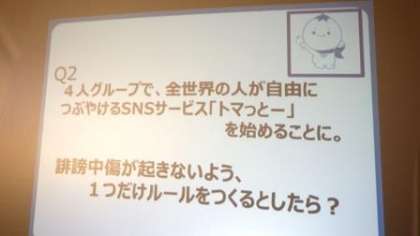 次に、悪口を書き込んだ「主人公は何がいけなかったのだろうか」について意見交流しました。さらに、日常的な場面を想定し「テストがあることを伝え忘れた級友にどんな反応をするか」を考え、自分の言動も「誹謗中傷」になる危険性があることに気づきました。さらに、「SNS運営上のルールを創作して設定するとしたら、どんな内容にするか」を考えました。
